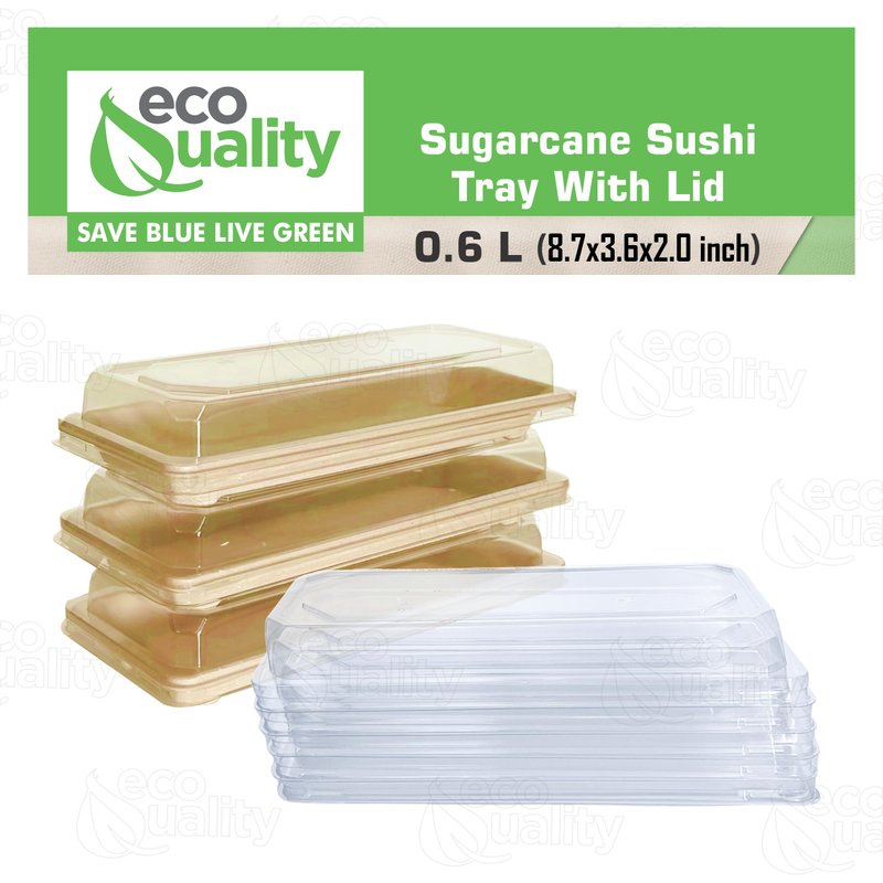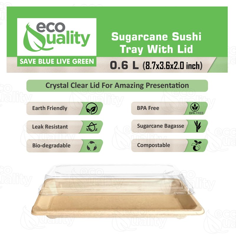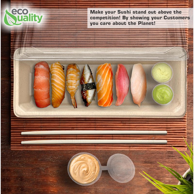 - PLASTIC ALTERNATIVE: Great alternative to plastic sushi trays, our small compostable EcoQuality Sushi Plates with clear lids are a great alternative to your everyday plastic sushi trays. Made from a 100% Biodegradable and Compostable Sugarcane bagasse. Elevate your presentation and standout from the competition while making a change to better our planet!