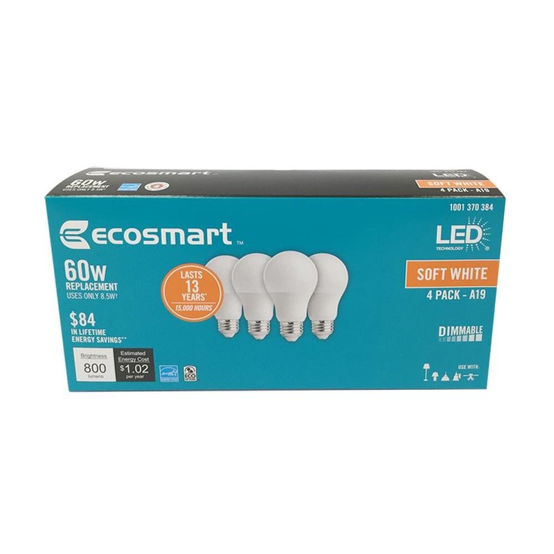 EcoSmart 60W Equivalent Soft White A19 Energy Star + Dimmable LED Light Bulb (4-Pack)