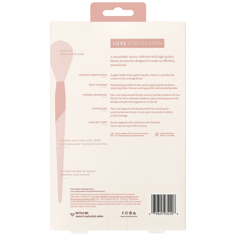 - EcoTools Luxe Limited Edition Natural Elegance Luxurious Face Brush Makeup Set includes (1) Angled Complexion Brush, (1) Softer Powder Brush, (1) Tapered Blending Brush, (1) Concealer and Foundation Brush, along with (1) Angled Liner Brush