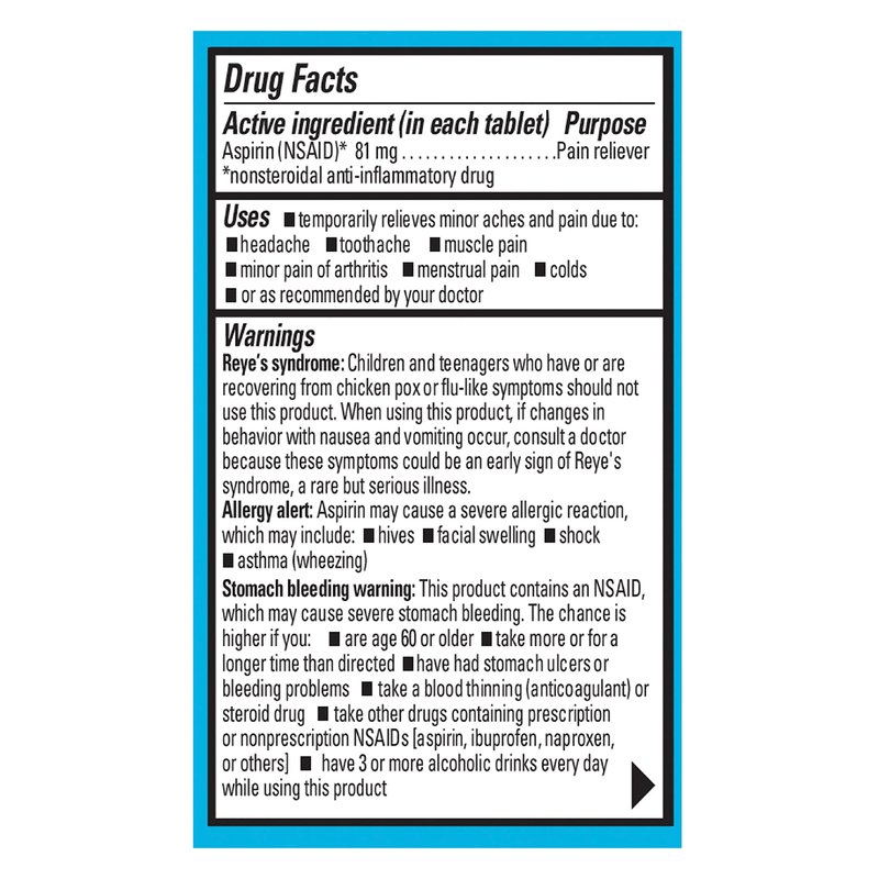 Ecotrin 81 mg Low Strength 45 Tablets is a unique formula that delivers 81 mg of aspirin (NSAID) per tablet. Smart for your heart, Ecotrin is safety coated and helps temporarily relieve minor aches and pains due to headache, toothache, muscle pain, minor arthritis pain, menstrual pain and colds.