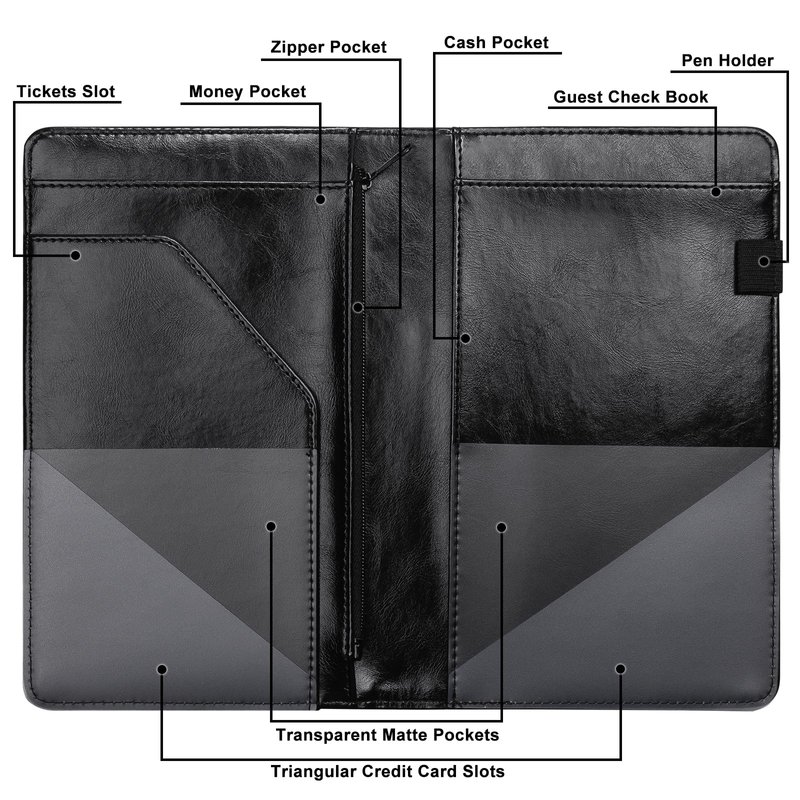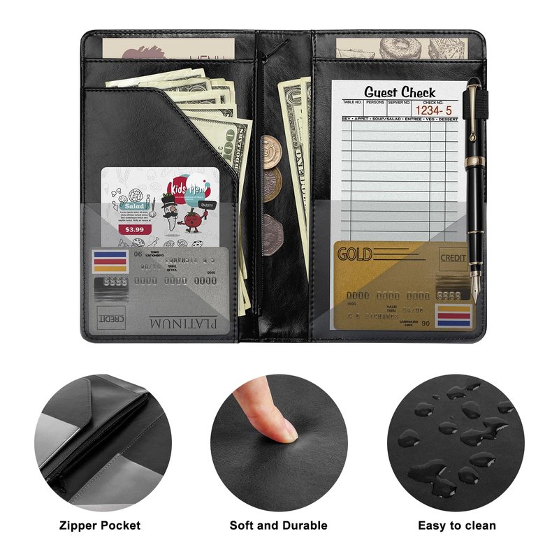 - 【Stay Organized All in Needs】: 9 compartments and 1 pen holder in one serving book, with a zipper pocket to store your coins, changes, and money. Multi-functional pockets to organize checkbooks, cash, ticket books, server pads, credit cards, coupons, or any other paper documents, nice waitress accessories partner for servers.