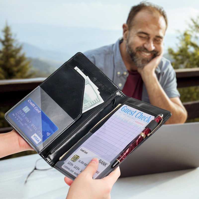 Make Serving Easier With the Ecovision Server Book. Help your servers stay organized and do their work more efficiently with our black server book. This large restaurant server book is designed to provide plenty of space for storage to carry full shift cash, credit card slips, receipts, order pads and so much more. 9 Pockets & 1 Pen Holder for a Variety of Storage Needs This server book for waitresses has 7 multi-function compartments that can effectively organize the Cash, Coin, Guest checkbook, Business cards, Credit cards, Receipt book, Tip sheet, and Pen. Separating the zipper pouch from the writing board helps the server write smoothly while keeping the money safe and secret. Practical Size & Durable Leather Our cute server book size is 8.3" x 4.3" x 0.4", it can be fit for server apron pocket well. This waitress book organizer is made of high-quality PU leather. It is soft and comfortable. This material is waterproof and easy to clean, you can easily remove surface stains with a wet cloth. Convenient Servers can tend to restaurant patrons attentively and quickly by keeping everything within easy reach with this product. The multiple pockets keep things organized so you can find them immediately. They also provide a secure place for the storage of cash and coins. This reduces cash being misplaced while leaving the server’s hands free to carry other items or perform necessary tasks. Ecovision server book for waitresses with zipper pockets is a great tool for servers. Designed with restaurant work in mind, it allows them to perform their duties efficiently while staying organized. We are so sure that restaurants and servers will love it that we offer a no-questions-asked refund policy if it does not meet expectations. Ecovision products' durability and convenience. If for any reason, you are unhappy with this wallet, please send an email to us. We will send you a refund or replacement immediately. Ecovision values your opinions and strives to please you.