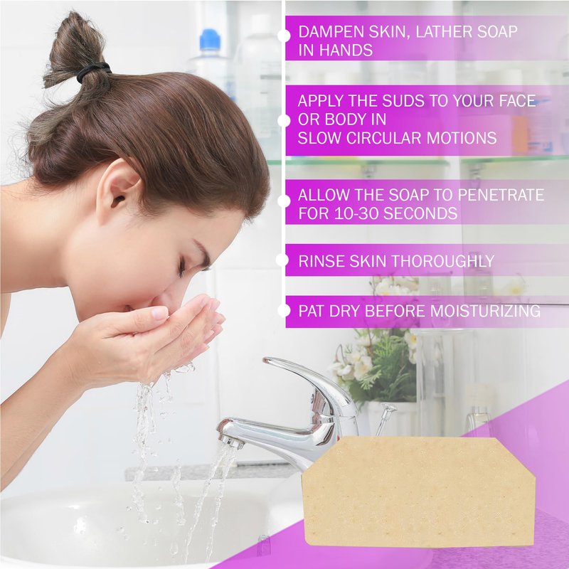 - EASY TO USE: Dampen skin, lather soap in hands and apply the suds to your face or body in slow circular motions. Allow the soap to penetrate for 10-30 seconds. Rinse skin thoroughly and pat dry before moisturizing.