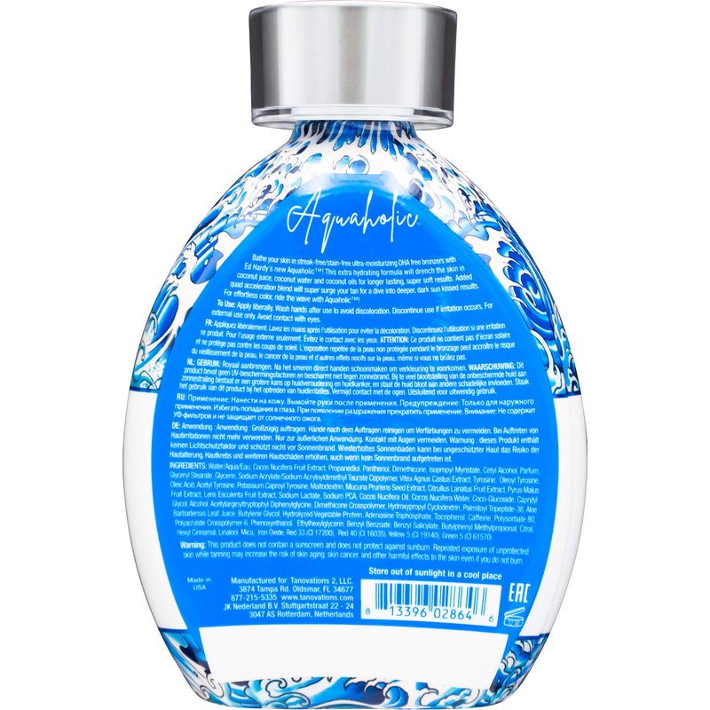 Bathe your skin in streak-free/stain-free ultra-moisturizing DHA free bronzers with Ed Hardy’s new Aquaholic! This extra hydrating formula will drench the skin in coconut juice, coconut water and coconut oils for longer lasting, super soft results. Added quad acceleration blend will super surge your tan for a dive into deeper, dark sun kissed results. For effortless color, ride the wave with Aquaholic!