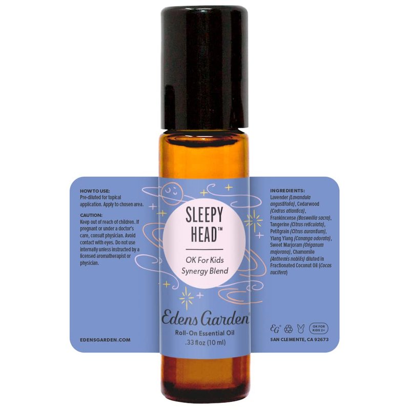 - Sleepy Head’s mission is to ease your body and mind for a sounder sleep. This roll-on is a thoughtful cocktail of Lavender, Cedarwood, Frankincense, Tangerine, Petitgrain, Ylang Ylang, Sweet Marjoram and Roman Chamomile. For those nights when your little one feels restless, simply apply Sleepy Head to their pulse points before storytime