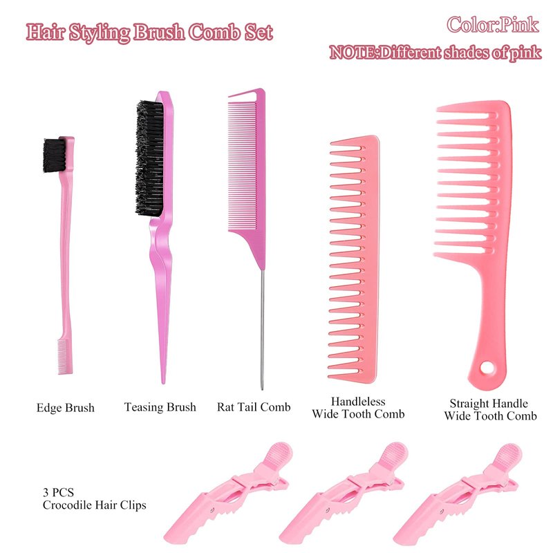 - 【8 PCS Hair Styling Comb Tools】:There are 8 pcs of hair tools including 1 edge brush 1 teasing brush 1 rat tail combs 2 wide tooth comb and 3 hair crocodile clips, which you can apply according to your needs, the hair tools with different appearances will bring more possibilities for your hairstyles. They are good slick back hair brush and parting comb.