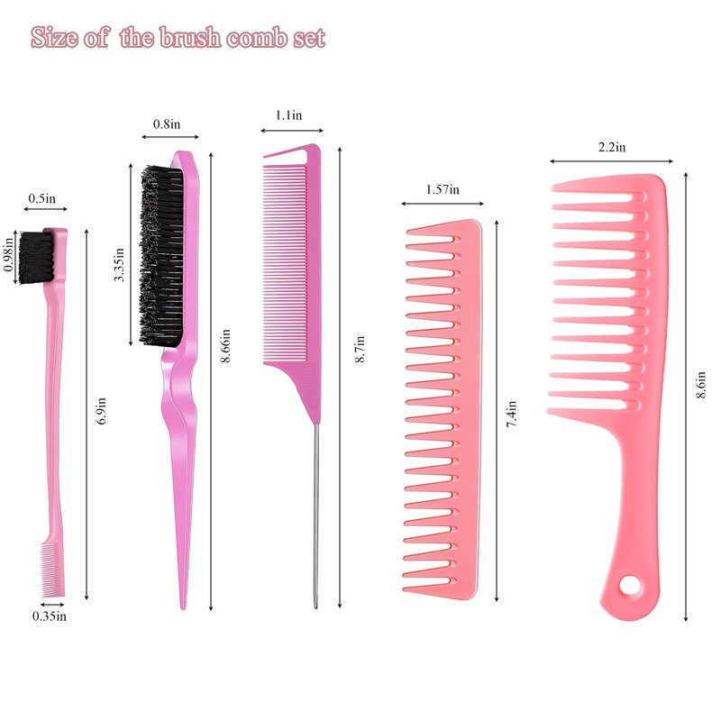 Edge Brush Teasing Brush Hair Comb Set with Wide Tooth Comb Rat Tail Comb and Hair Clips for Women Kids Baby Girls Smoothing Combing & Styling Hair (Pink)