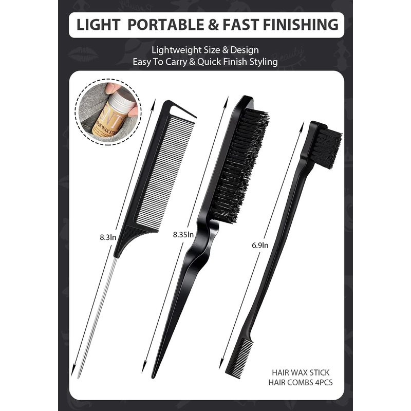 Quantity: 1PCS【Hair Wax Stick】+1PCS【Rat Tail Comb】+1PCS【Teasing Brush】+1PCS【Edge Brush】