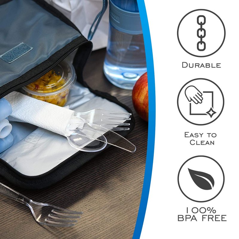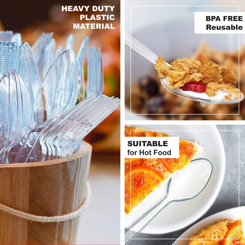 This set of assorted, heavy-duty, clear plastic cutlery is made from highly durable, BPA-free plastic. So good you will want (and can) wash and reuse it. Whether you're serving soup, steak or cake - our cutlery will stand up to the test. Disposable, for a quick and easy clean up. This set comes with 32 forks, 32 knives, and 32 spoons. For your heaviest, messiest meals, EDI has you covered.