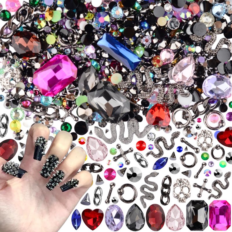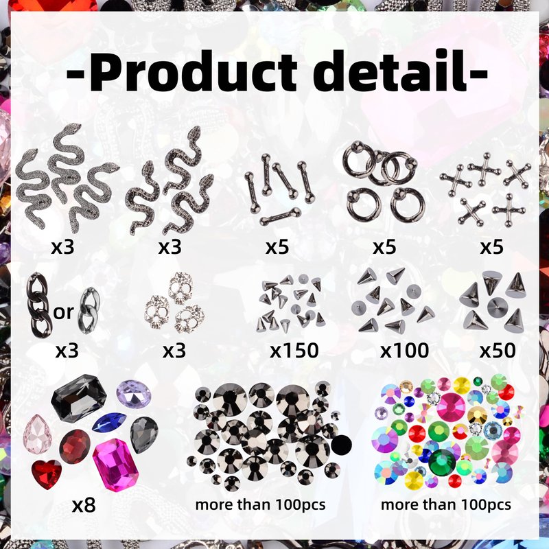 - Package include: You will get more than 500 pieces punk nail art charms. Include 300 pieces 3 sizes metal cone nail charms,27 pieces various shapes alloy nail studs, 9 piece big glass nail pointed bottom rhinestones gems, more than 200 pieces flatback resin rhinestones.