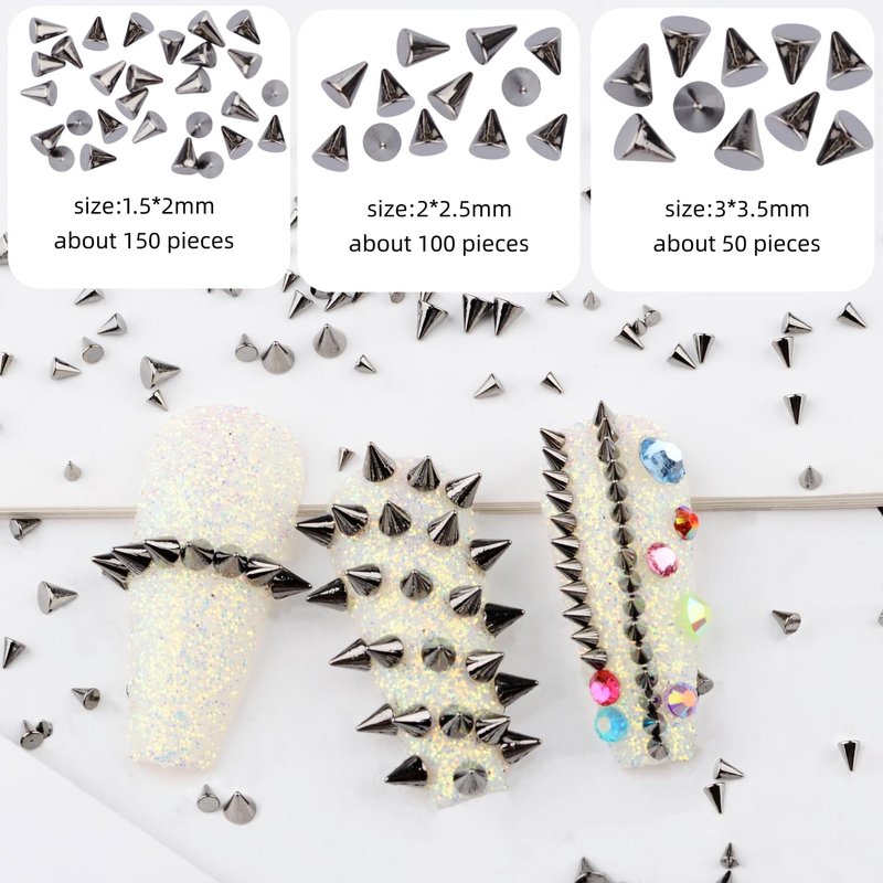 - Cone metal rivet nail studs: These tapered nail supplies are flatback design, they are very easy to stick on nails with glue. Include 1.5*2mm(150pcs), 2*2.5mm(100pcs), 3*3.5mm(50pcs). These punk metal studs are perfect for any DIY project, for example necklaces, bracelets, bags, shoes, jackets, jeans, dog collars and so on.