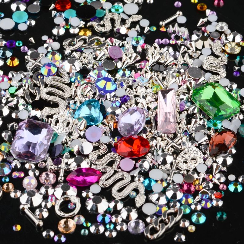 - Package include: You will get more than 500 pieces punk nail art charms. Include 300 pieces 3 sizes metal cone nail charms,27 pieces various shapes alloy nail studs, 9 piece big glass nail pointed bottom rhinestones gems, more than 200 pieces flatback resin rhinestones.