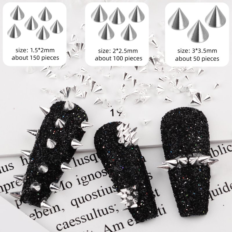 - Cone metal rivet nail studs: These tapered nail supplies are flatback design, they are very easy to stick on nails with glue. Include 1.5*2mm(150pcs), 2*2.5mm(100pcs), 3*3.5mm(50pcs). These punk metal studs are perfect for any DIY project, for example necklaces, bracelets, bags, shoes, jackets, jeans, dog collars and so on.