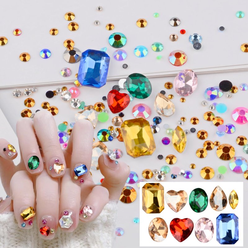- Big sparkling pointed bottom gems: 9 pieces different rhinestones are made of glass material. Vary in size from 3mm to 14mm, star, heart, round, rectangular, square, oval, teardrop shape, various gems randomly mixed packaging. The nail rhinestones you receive may contain all of the above shapes, or only some of them.
