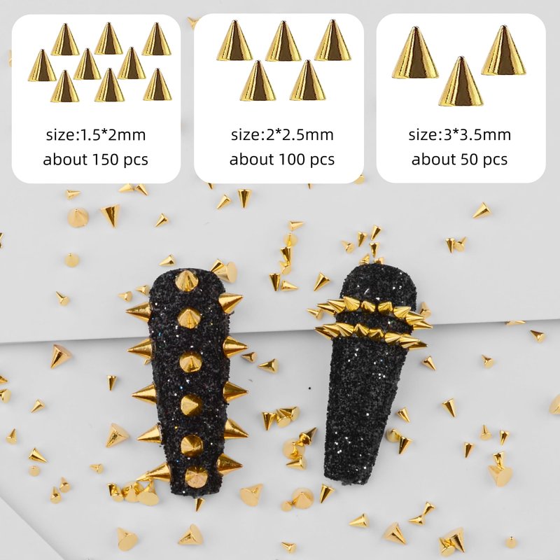 - Cone metal rivet nail studs: These tapered nail supplies are flatback design, they are very easy to stick on nails with glue. Include 1.5*2mm(150pcs), 2*2.5mm(100pcs), 3*3.5mm(50pcs). These punk metal studs are perfect for any DIY project, for example necklaces, bracelets, bags, shoes, jackets, jeans, dog collars and so on.