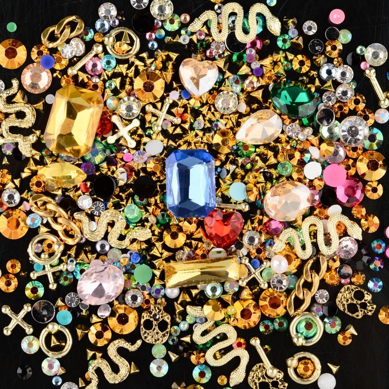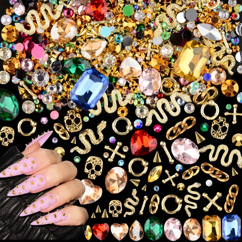 - Package include: You will get more than 500 pieces punk nail art charms. Include 300 pieces 3 sizes metal cone nail charms,27 pieces various shapes alloy nail studs, 9 piece big glass nail pointed bottom rhinestones gems, more than 200 pieces flatback resin rhinestones.