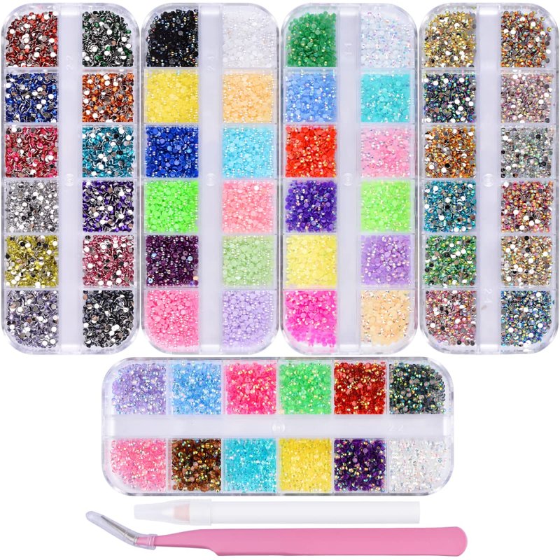editTime nail rhinestones kit comes with 5 boxes 13200 pieces various nail rhinestones, a tweezers and a pencil.