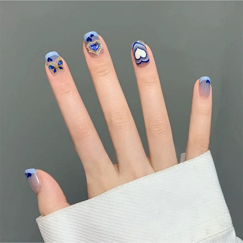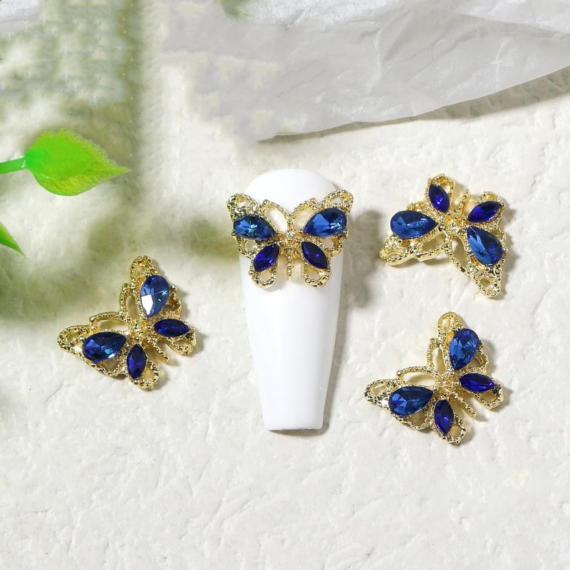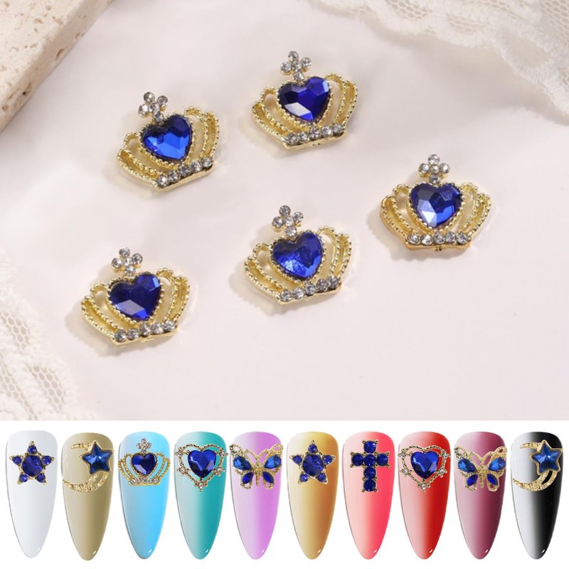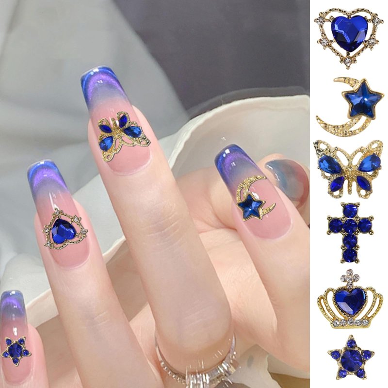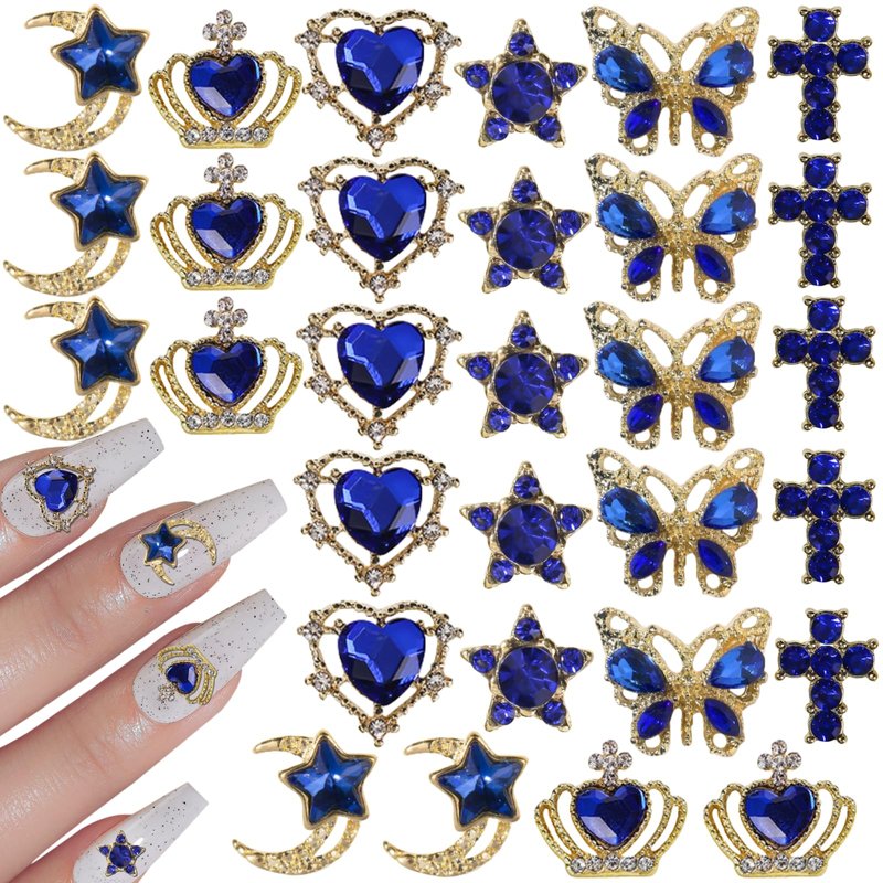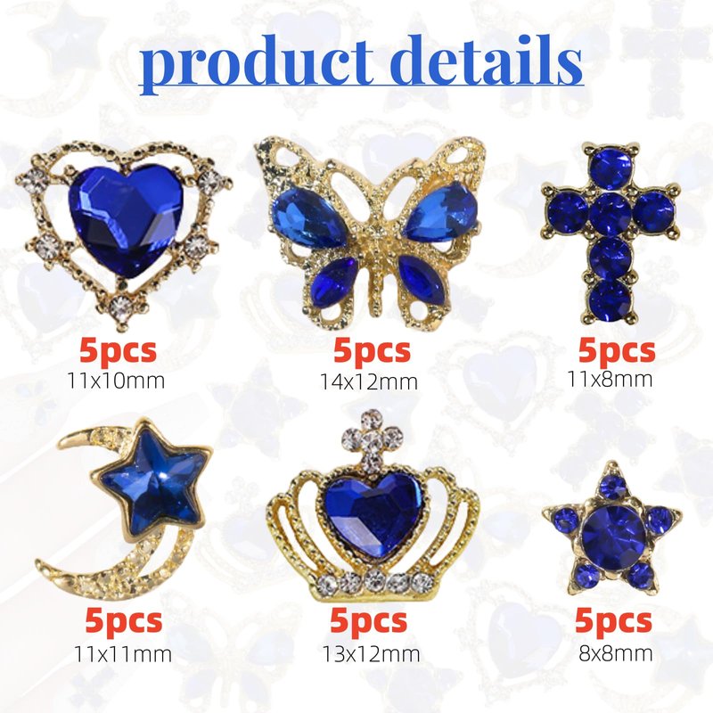 editTime Metal Alloy Nail Charms Rhinestones Kit 3D Gold Silver Stars Butterfly Heart Rose Flower Nail Gems Shiny Crystal Rhinestones Diamonds Jewelry (blue-30)