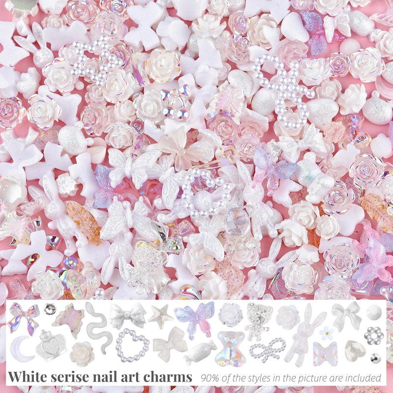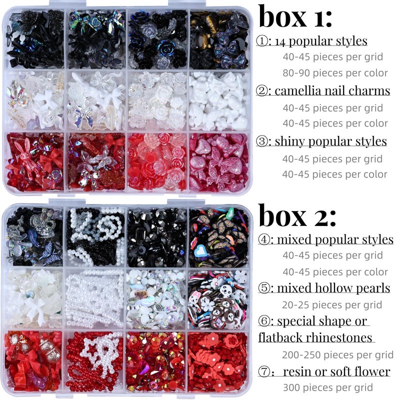 - Great amount fashion style nail decoration: You will get 1 box nail art decoration, more than 50 style. Include 700pcs different shapes resin charms, 150pcs special shape diamond, 600pcs flatback rhinestones or pearls, 300pcs nail small flower, 300pcs nail soft slice.