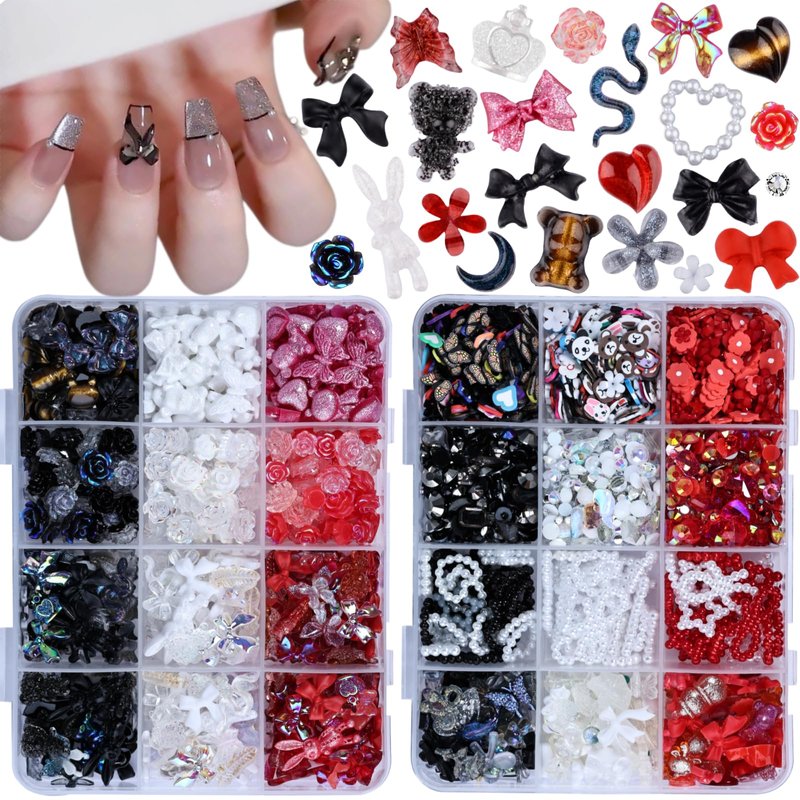 editTime Mixed Style Fashion 3D Nail Art Charms Kit Resin Camellia Rose Flower Butterfly Bow Moon Heart Bear Snake Hollow Pearl with Rhinestones and Soft Slice (Black White red)