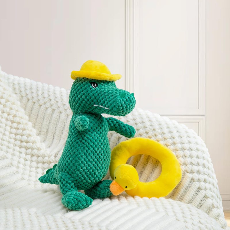 A 11.5 inch Super Cute Crocodile On Vacation with Swimming Ring Gift Suit for All Size Dogs or Baby Unique Crocodile character and bright colors are great for bouncing, shaking, tossing; It is designed with raised surface that help clean your dogs teeth and massage their gums; This dog treat toy made of natural cotton and plush which is safe and has a comfortable touch feeling; It is durable but not an indestructible dog toys, pls supervise your pup while playing; Chewing toys reduce boredom,improve bad habits.