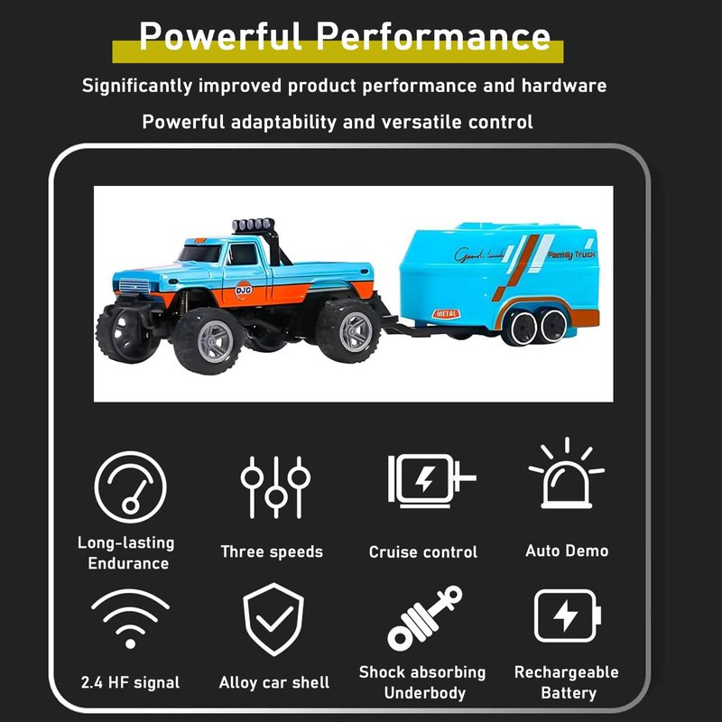 - Built-In Headlights and Taillights: Equipped with front and rear lights, this RC truck delivers an authentic driving experience. Bright white headlights and red taillights adapt to driving actions, creating a realistic adventure no matter where you play, even in low light