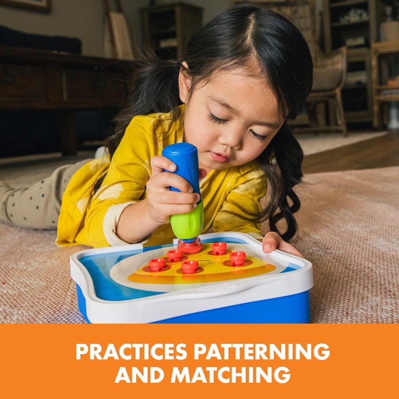 - POP INTO EARLY LEARNING! Busy builders use a hand-powered rivet tool and rivets that “pop” when they’re placed to complete the colorful patterns on the included cards