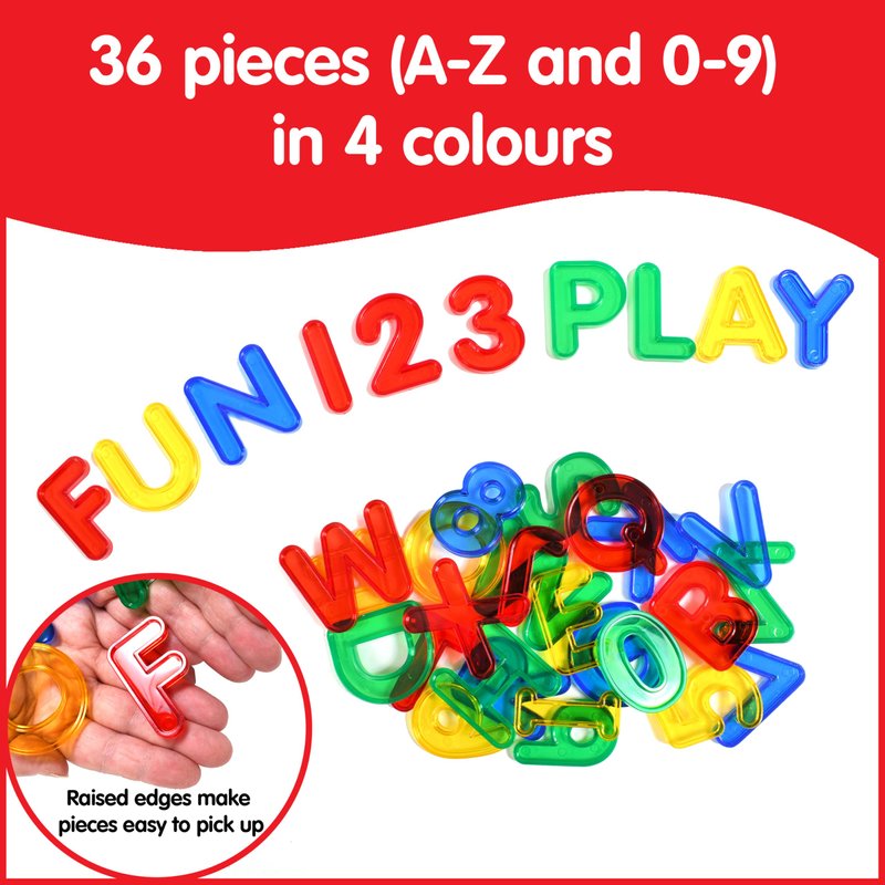 - EXPLORE LIGHT AND COLOR -- Place these letters and numbers on a light panel and watch the colors spring to life! These transparent manipulatives are ideal to explore attributes and color mixing.