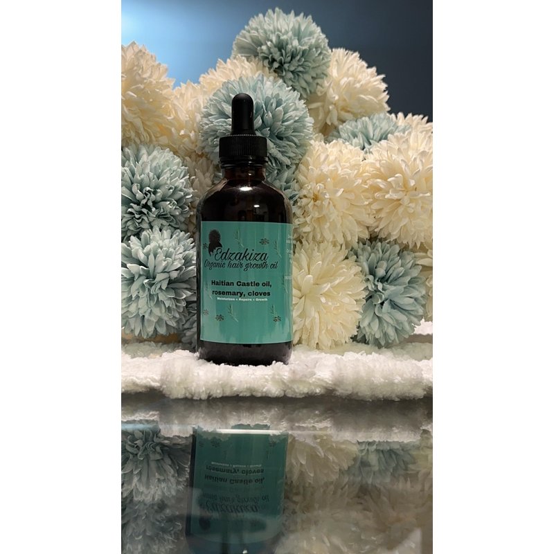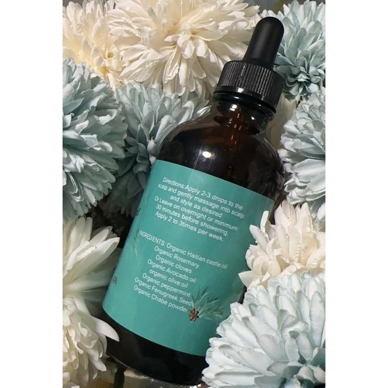 Our hair growth oil Is 100% organic. PROMOTE HAIR GROWTHS SAFE FOR ALL HAIR TYPES SMOOTH SPLIT ENDS NOURISH & STRENGTHEN SOOTHE DRY SCALP promoting blood circulation and encouraging healthy hair growth.JUMBO Size: With a generous 4 ounce size, our Hair Growth Oil provides lonq-lasting nourishment to vour scalp and promotes healthy-looking locks. Suitable for All Hair Types: INGREDIENTS: Organic Haitian castle oil Organic Rosemary Organic cloves Organic Avocado oil organic olive oil Organic peppermint Organic Fenugreek Seeds Organic chebe powder Directions: Apply 2-3 drops to the scalp and gently massage into scalp and style as desired Or Leave on overnight or minimum 30 minutes before showering. Apply 2 to 3times per week.