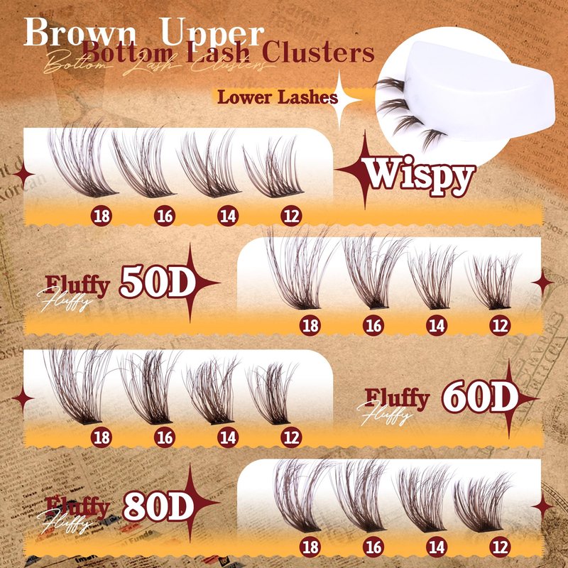 - Natural Upper Lash Clusters: The length of brown wispy lashes, 50P, 60P and 80P individual lashes ranges from 12 to 18 mm. Bottom lashes (5-6 mm) can supplement blank of lower eyelid and cooperate with upper eyelash extension to enlarge your eyes better
