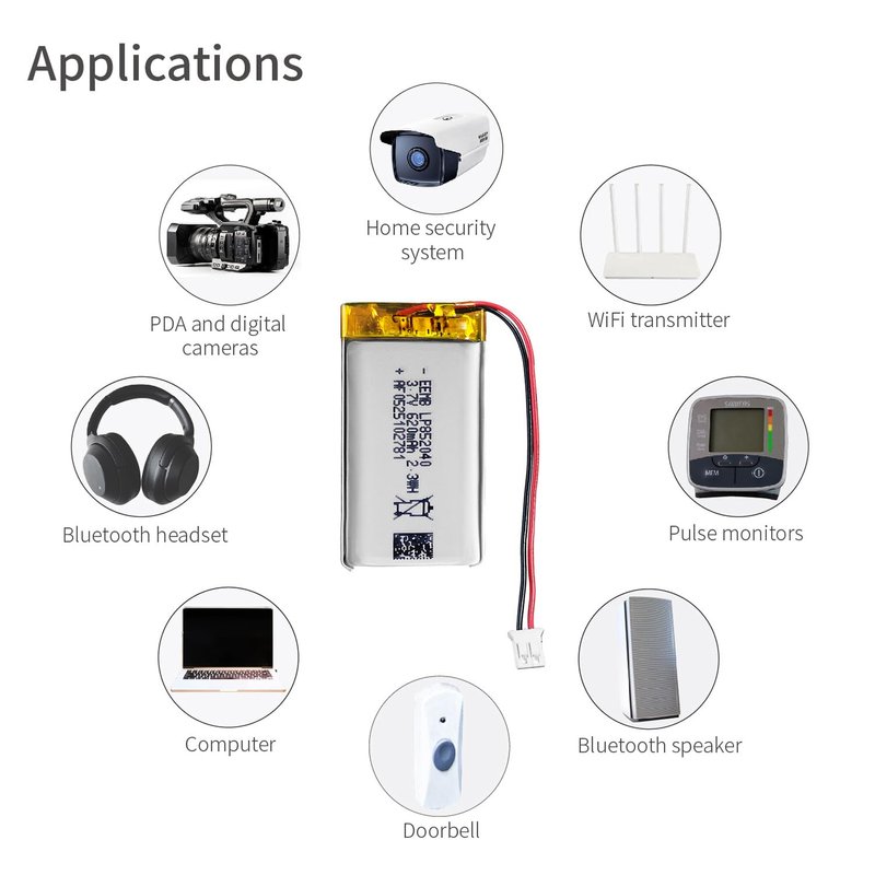 - STORAGE & APPLICATION¡ªKeep the cells in 40%-60% charged state during long period storage. We recommend to charge the battery every 3 months after receipt of the battery and maintain the voltage 3.7-4.0V. Store battery in cool and dry place.//SUITABLE for Bluetooth speaker, dash cam, keyboard and mouse, Wi-Fi enabled smart home systems, PDA and digital cameras, GPS, monitoring units, e-books, tracking devices, sleep management equipment, blood oxygen tracking equipment, pulse monitors.