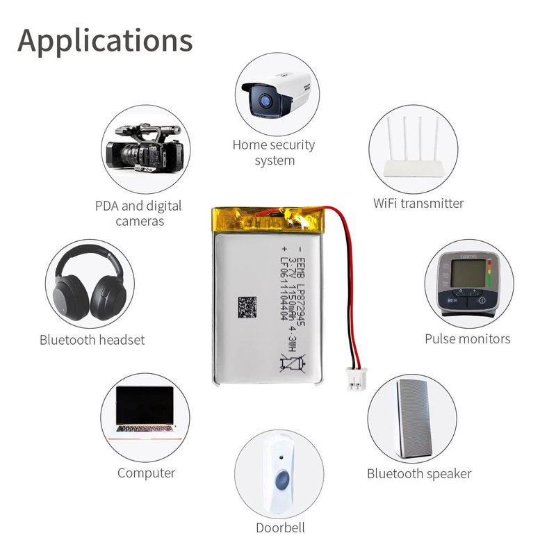- STORAGE & APPLICATION—Keep the cells in 40%-60% charged state during long period storage. We recommend to charge the battery every 3 months after receipt of the battery and maintain the voltage 3.7-4.0V. Store battery in cool and dry place.//SUITABLE for Bluetooth speaker, dash cam, keyboard and mouse, Wi-Fi smart home systems, PDA and digital cameras, GPS, monitoring units, e-books, tracking devices, blood oxygen tracking equipment, pulse monitors, wireless, IoT.