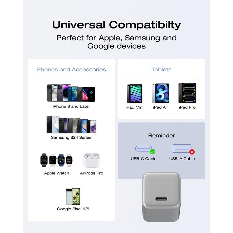 - Free USB-C Cable Included: We include a high-quality USB-C cable with our USB-C GaN Charger (20W), ensuring you have everything you need for fast and efficient charging without additional costs.
