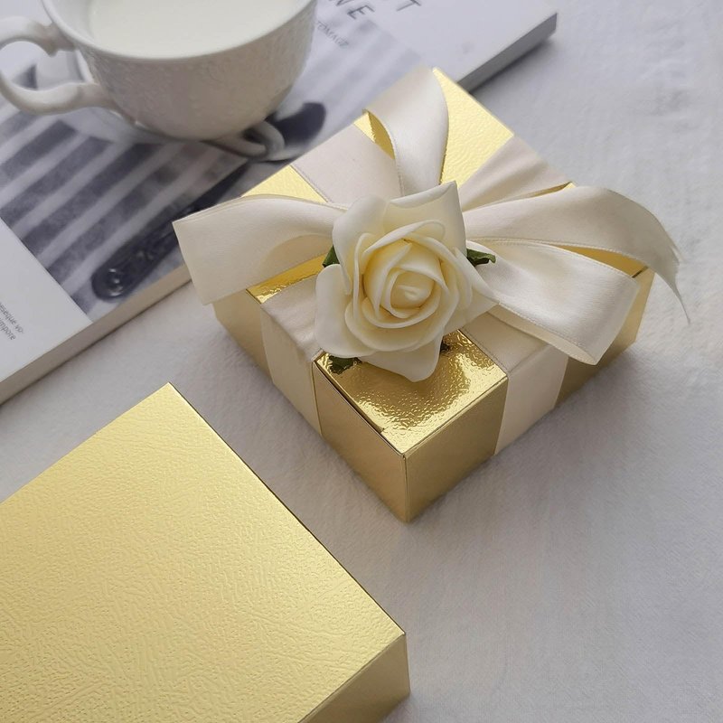 - Quantity: 100 Favor Boxes Material: Cardstock Color: Gold Box Measurements: 4" x 4" x 2" Thickness: 1mm Boxes are shipped flat for easy assembly. Item is for the boxes only, ribbons and other decorations on picture are NOT INCLUDED.