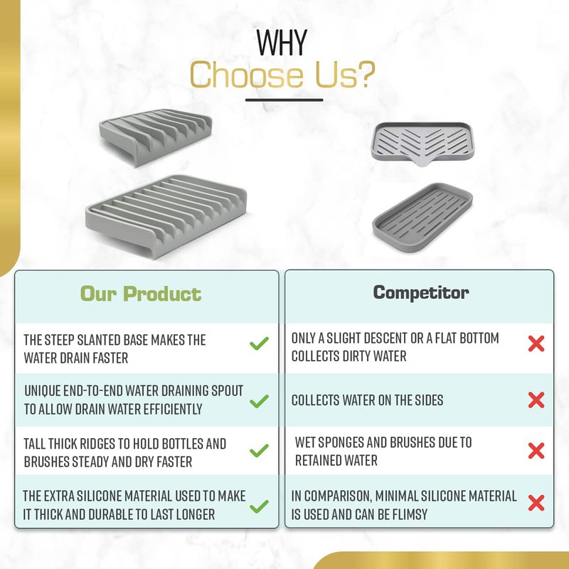 Effilogic Makes Your Life Efficient with Smartly Designed Products, Like this Self Draining Silicone Kitchen Sink Soap Tray. Our brand name, Effilogic, stands for efficient and logical. At Effilogic, we strive to develop efficient products that are logically thought through. We want our customers to have confidence knowing that they purchased the highest quality product which will make their lives more efficient, including our Kitchen Sink Tray which drains water automatically. Our patented design features deep wedge shaped self-draining channels and slanted floor which naturally drain water out into the sink through the lip, while small water droplets retained will evaporate quickly. Other dish drying mats may have drain holes but water drips onto the edge and gets stuck underneath the mat and may damage your counter.