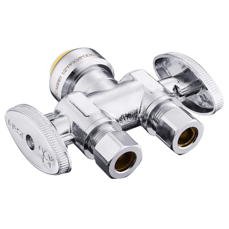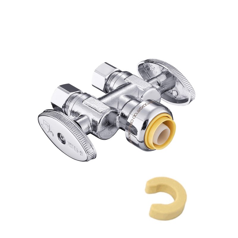 - 1 Piece Lead Free Push Fit 1/2" x Dual 3/8" OD Compression Straight Stop Valve, 1/4 Turn with a Disconnect Clip Tool