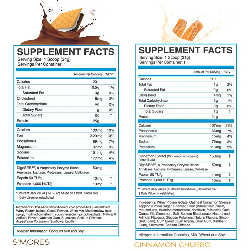 - INCLUDES 4 SINGLE SERVING 100% WHEY PROTEIN ISOLATE SAMPLE PACKS: S'mores, Cinnamon Churro, Birthday Cake, Brownie Batter. (With Real Cereal Pieces!) - Flavors may vary, while supplies last.