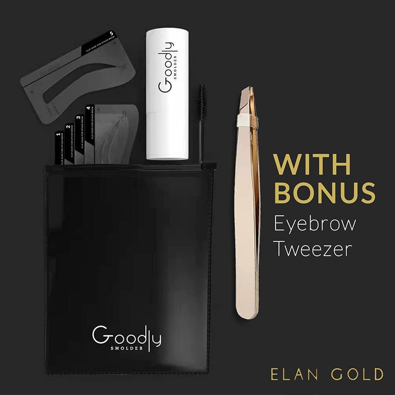 Effortless & Flawless Eyebrows in Minutes! If you want perfect eyebrows without the hassle, our eyebrow stamp and stencil kit is the perfect tool for you Goodly by Elan Gold Eyebrow Stamp Stencil Kit Includes: Medium Brown Eyebrow Stamp Five Brow Stencils Gold Eyebrow Tweezer Brow Spooly Brush Makeup Pouch HOW TO USE: Step 1 Choose the appropriate eyebrow stencil for your desired brow shape, align with your brows using the grid lines Step 2 Open stamp, dip and twist inside lid for more product Step 3 Stamp onto eyebrow, applying starting from the end of your eyebrow Step 4 Clean up any stray hairs with the included eyebrow tweezer