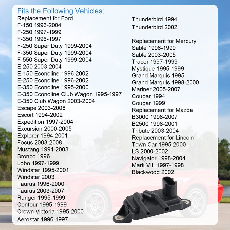- FITMENT replacement for Ford:F-150 F-250 F-350 1996-2004,F-250 F-350 F-550 Super Duty 1999-2004,E-250 2003-2004, E-150 E-250 E-350 Econoline 1995-2002,Escape 2003-2008,Expedition 1997-2004,Explorer 1994-2001, Focus 2003-2008, for Mustang 1994-2003,Bronco 1996,Ranger 1995-1999.