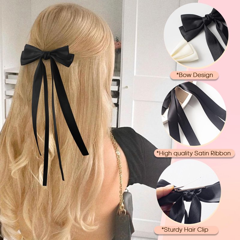 EHBELIF Hair Bows for Women Bow Hair Clips Pink Hair Ribbon Bow Tassel Hair Bow with Long Tail Silk Bowknot Hair Clip Barrettes Solid Satin Hair Accessories for Women and Girls (Black&white)