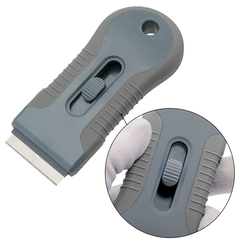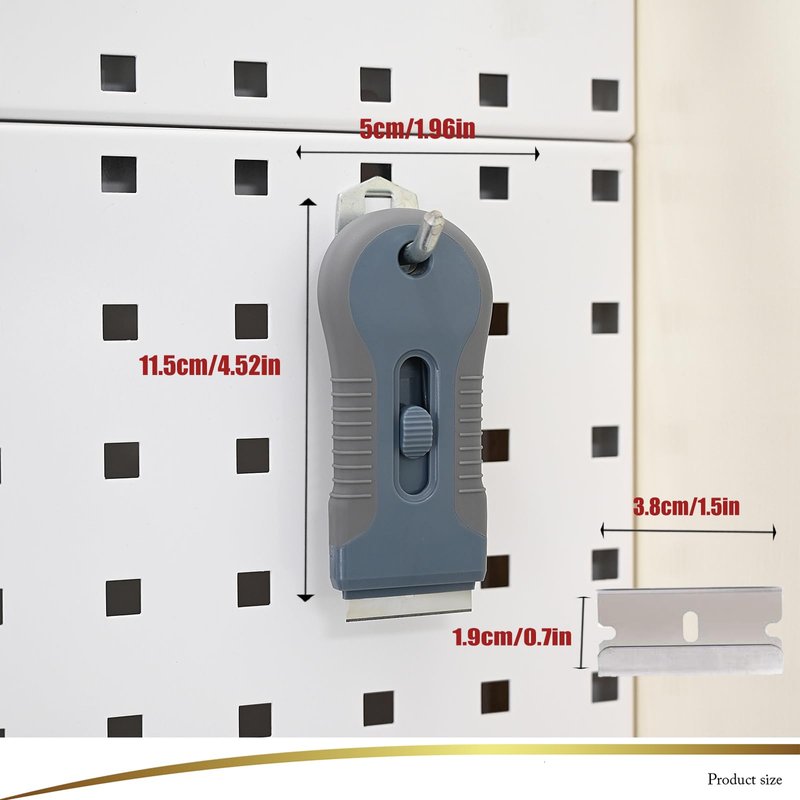 - Practical and Safe Adhesive Remover Scraper- The scrapers and blades are packed in a small box that is inaccessible to children and pets. The scraper has holes at the top for hanging. The button on the handle has three positions that are designed to return the blade, function normally, and replace the blade.