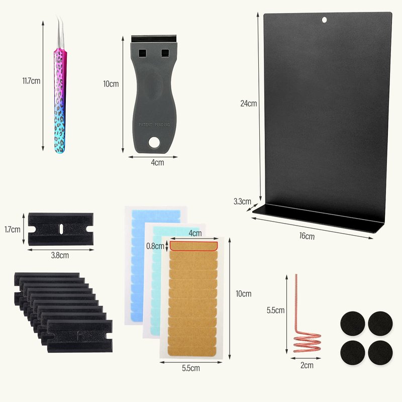 - Package Included: 1*Tape Remover Board, 1*Tape Scraper Tool with 10 pcs extra blades,1*Tweezers,3pcs*Hair Adhesive Tape,1*Hair Selecting Tool,4*Sponge Pad