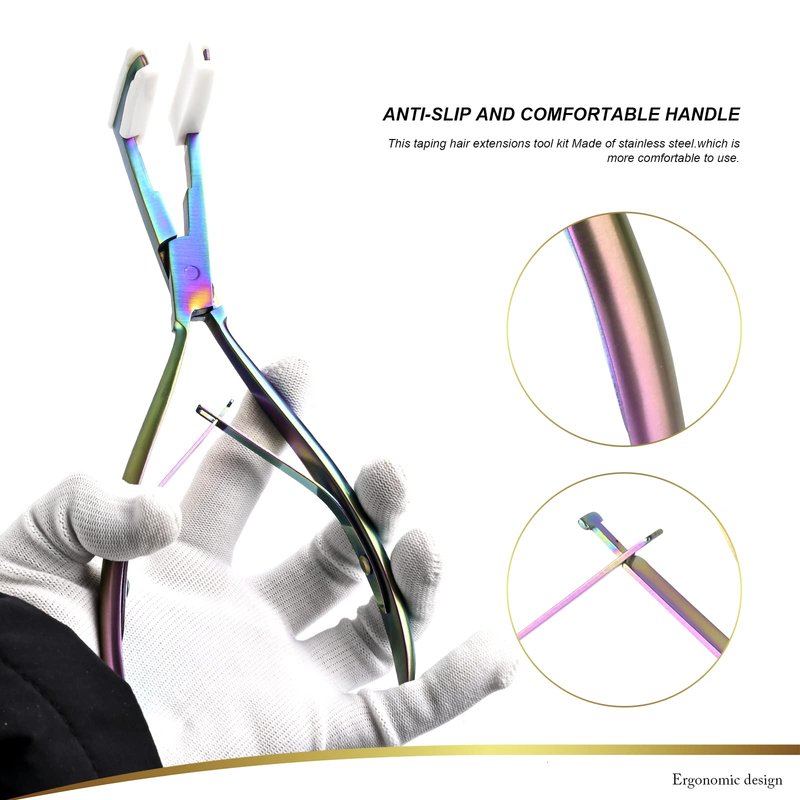 - The hair extensions tools pliers design two silicon pads jaws on top. Peel, stick and press with our tape pliers, make it seal the tape in human hair extensions easily and gently. Looks more natural and firmer, and it can also prolong the usage of hair extensions.