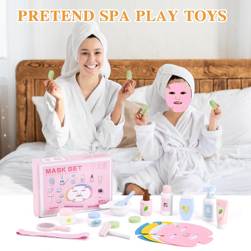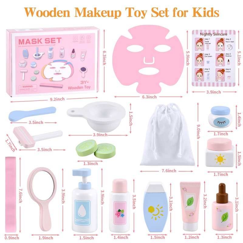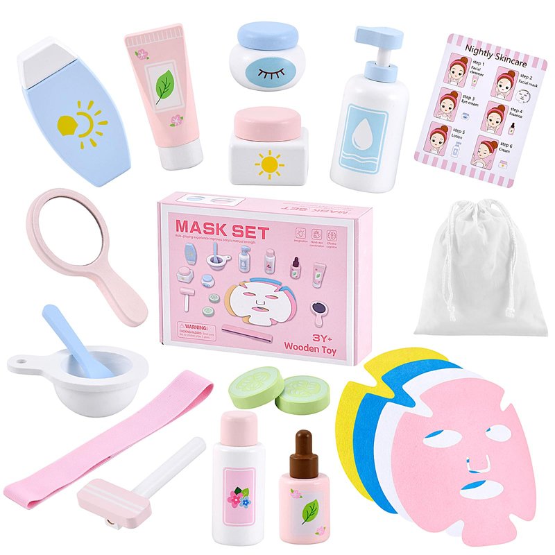 - 20PCS Wooden Toys Makeup Kit : The wooden beauty salon play set with storage bag will come to you with a mirror, razor, 2* eye masks, 2* face creams, sunscreen, facial cleanser, facial toner, essence, face mask mixing bowl, mask stick, hair band, 4* masks.