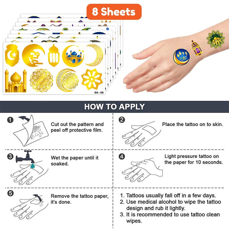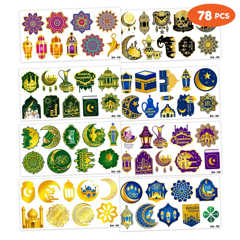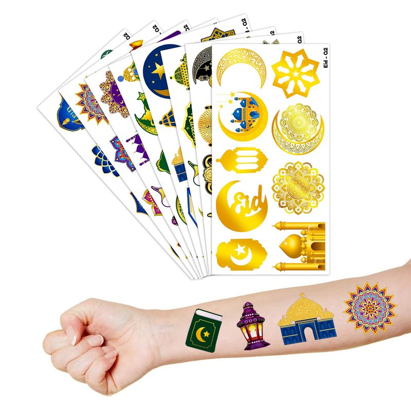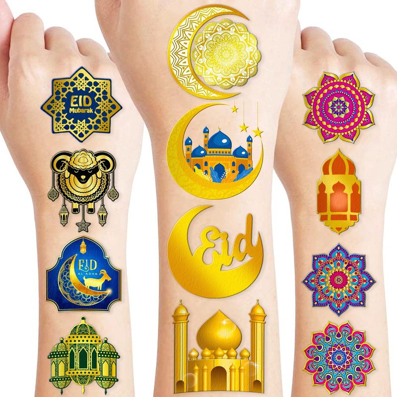 - The Perfect Cute And Funny Eid Al Adha Ramadan Mubarak Theme Party Gift: 8 Sheets Eid Al Adha Ramadan Mubarak tattoos stickers, each sheet measures 6.1 * 3.1 inch , one size fit all adult and kids. One of the most popular party themes for children, make the best party gifts for your children & Carnival gifts, help your children become small heroes at the party! Bring nonstop joy to the whole party! Make your kids receive full of expectation and exploration in every festival.