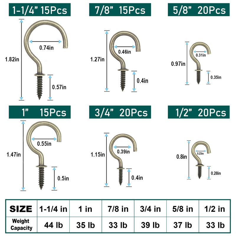 - 【Various Sizes】Assorted sizes of cup hooks to meet your needs: 1-1/4 inch(15pcs), 1 inch(15pcs), 7/8 inch(15pcs), 3/4 inch(20pcs), 5/8 inch(20pcs), 1/2 inch(20pcs), 105pcs in total