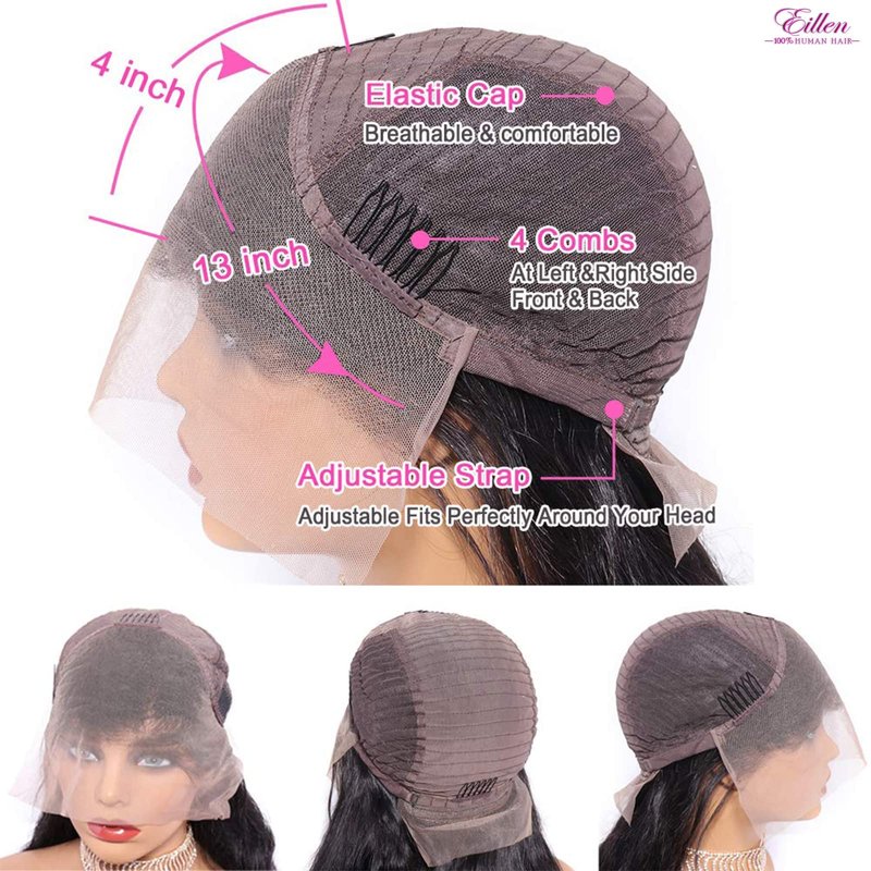 - GLUELESS WIGS HUMAN HAIR - Medium Cap 21.5-22.5". The lace part is cut once and can be turned into wear and go glueless wigs for use. There are 2 adjustable straps for adjusting the size of the hat opening