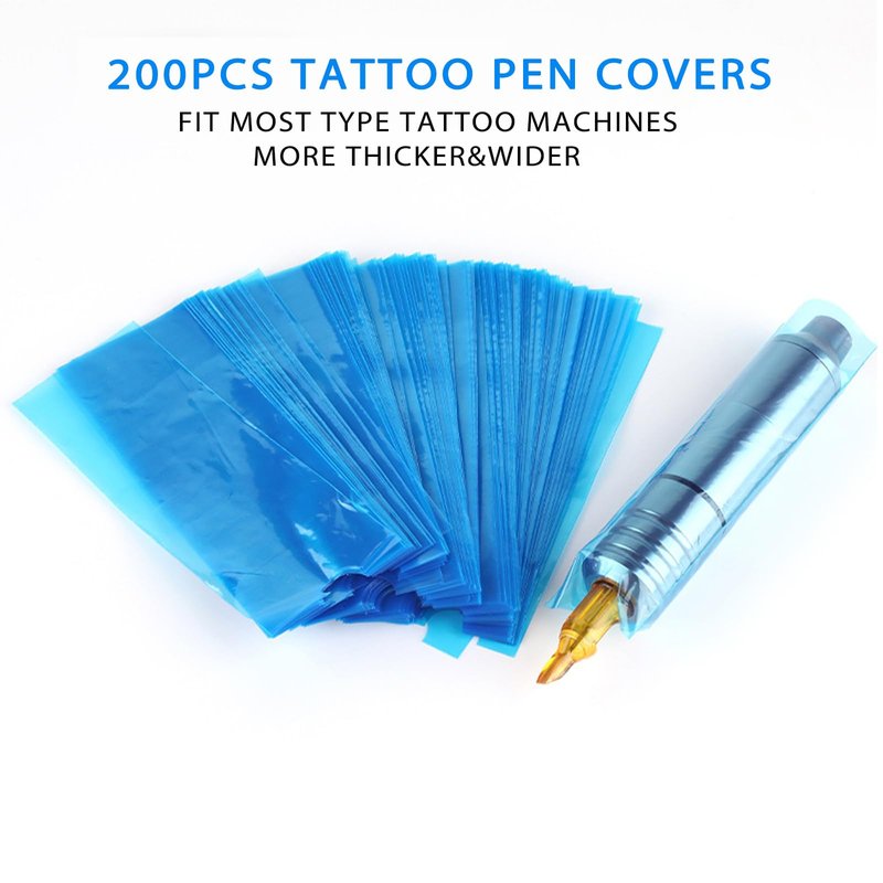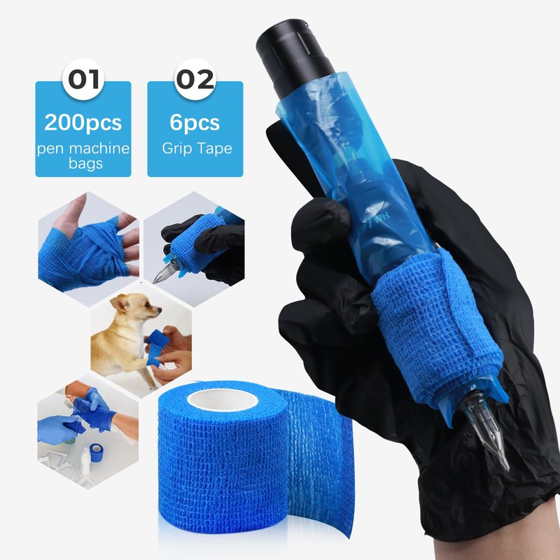 EIPTWH 200PCS Tattoo Pen Covers with 6PCS Tattoo Grip Tapes,Blue Tattoo Machine Wraps Covers with Tattoo Pen Sleeves Bags Set for Tattoo Artist Tattoo Supplies