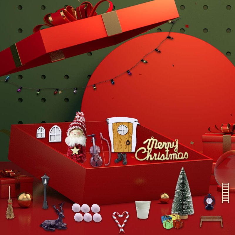 - 33 Doll House Christmas Decoration: Our christmas dollhouse decorations include wooden doors, broom, 6 snow globes, a Merry Christmas text, 4 gift boxes, 2 windows (one large and one small), lighthouse, a pair of boots, 3 candy canes, 2 oil lamps, a fawn, a ladder, a carpet, a doll, a Christmas tree, a string of decorative lights, a violin, a cup, and self-adhesive stickers etc.