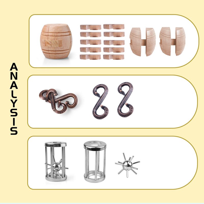 A COMBINATION OF LEARNING AND FUN Brain teaser puzzle sets combine fun and learning at the same time. It also helps improve focus and concentration in kids and teens as well as improve their IQ and EQ. It's very interactive yet also works with individual players. FEATURES: The puzzles look simple but contain lots of mysteries. They are easy to disassemble but difficult to assemble.